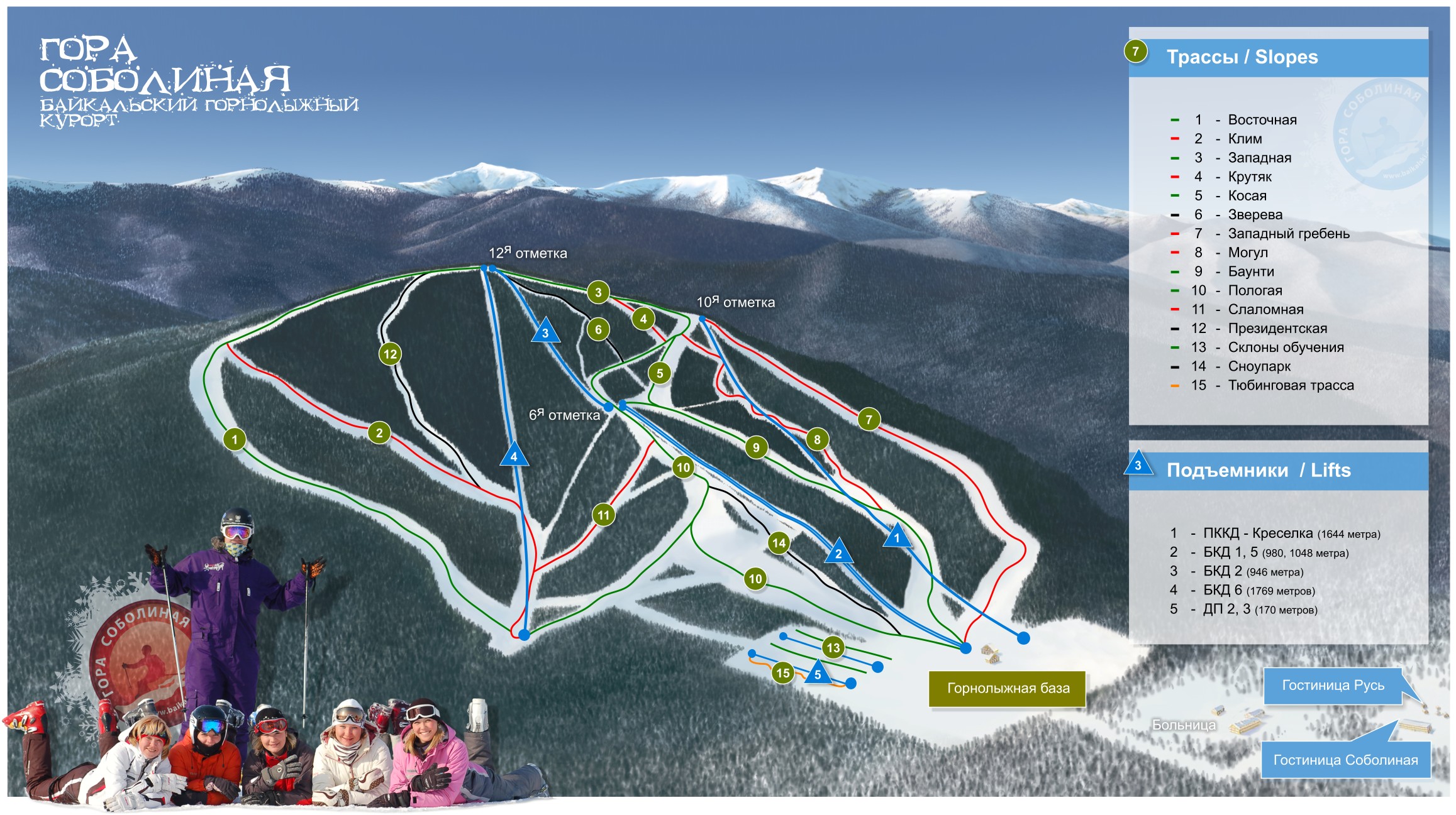 На Горе Соболиной, наивысшая отметка которой 1004 м над уровнем моря, в восточном и западном направлении проложены разветвленные трассы различной степени сложности. Общая протяженность трасс более 15 км. Перепад высот, от приводной станции до вершины горы – 475 м. Во время проведения соревнований место финиша возможно расположить ниже привода канатной дороги, вследствие чего достигается перепад 500 м. Система искусственного оснежения (3 снеговые пушки фирмы LENKO) охватывает трассы: Пологая, Баунти, Слаломный, Объездная, Гребень, Могул, склон обучения.